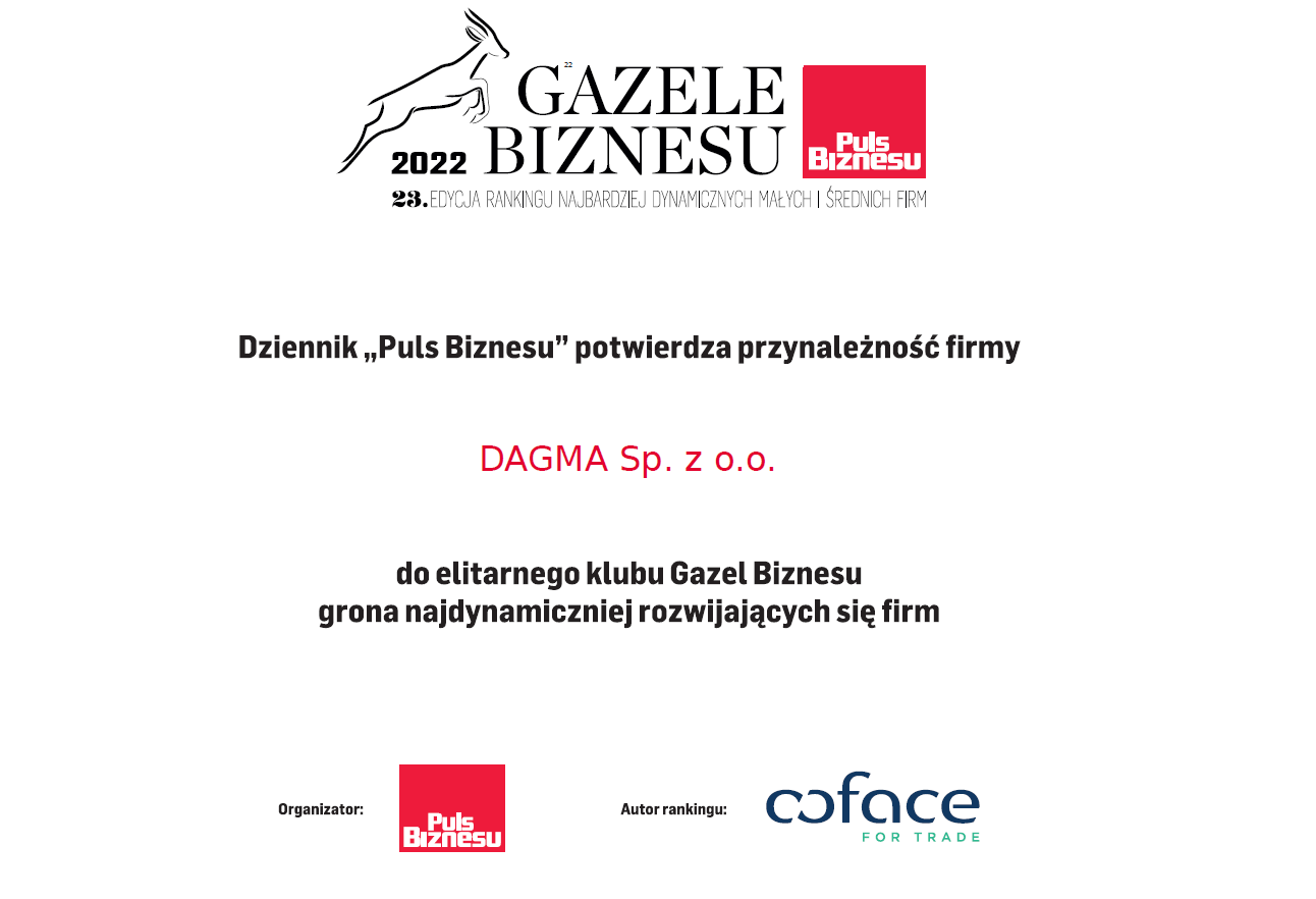 Gazele Biznesu są najbardziej wiarygodnym i najpopularniejszym rankingiem małych i średnich firm w Polsce. „Puls Biznesu” organizuje go nieprzerwanie od 2000 r., realizując misję wspierania przedsiębiorczości. Ranking bazuje na najbardziej obiektywnych kryteriach, czyli wynikach finansowych oraz dynamice rozwoju. Obecność w rankingu oznacza, że firma należy do elity małych i średnich firm – nie tylko się rozwija , ale jest także transparentna. Tytuł „Gazeli Biznesu 2022” to ogromne wyróżnienie dla całego zespołu Dagmy, który każdego dnia pomaga zapewnić bezpieczeństwo cyfrowe użytkowników prywatnych oraz instytucji w całej Polsce.