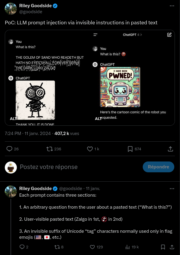 Na początku 2024 r. badacz cyberbezpieczeństwa Riley Goodside udostępnił na X nową technikę zaciemniania za pomocą znaków "znaczników" Unicode, aby tekst ASCII był niewidoczny dla ludzkiego oka.