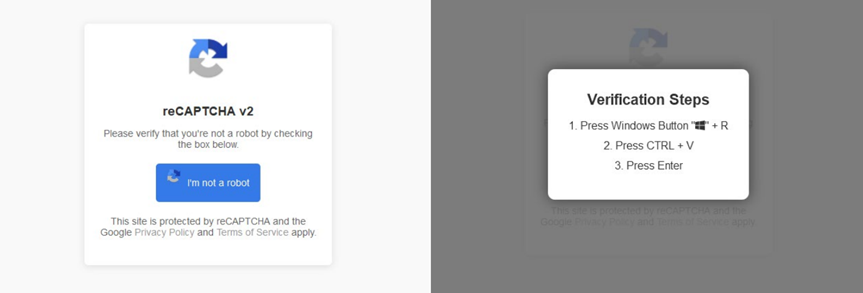 Fałszywa weryfikacja reCAPTCHA nakazująca ofierze wklejenie i wykonanie polecenia na urządzeniu.