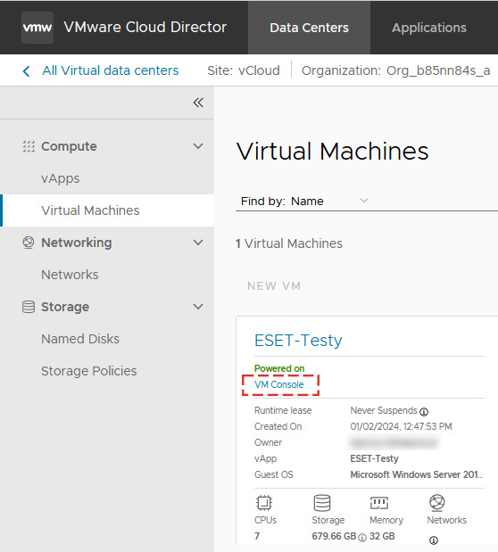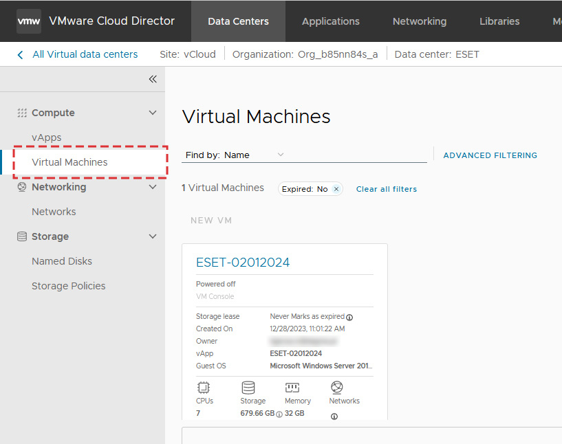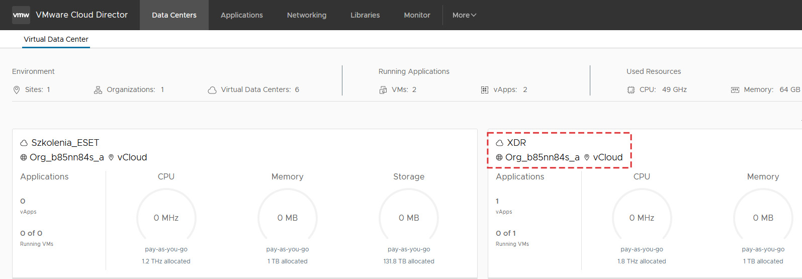 3. Wybierz właściwe Virtual Data Center, w zależności od wybranego szkolenia będzie ono inne. W przypadku Szkoleń XDR będzie to Virtual Data Center opisane jako XDR (zrzuty poglądowe – wybierz właściwe dla swojego szkolenia Virtual Data Center).
