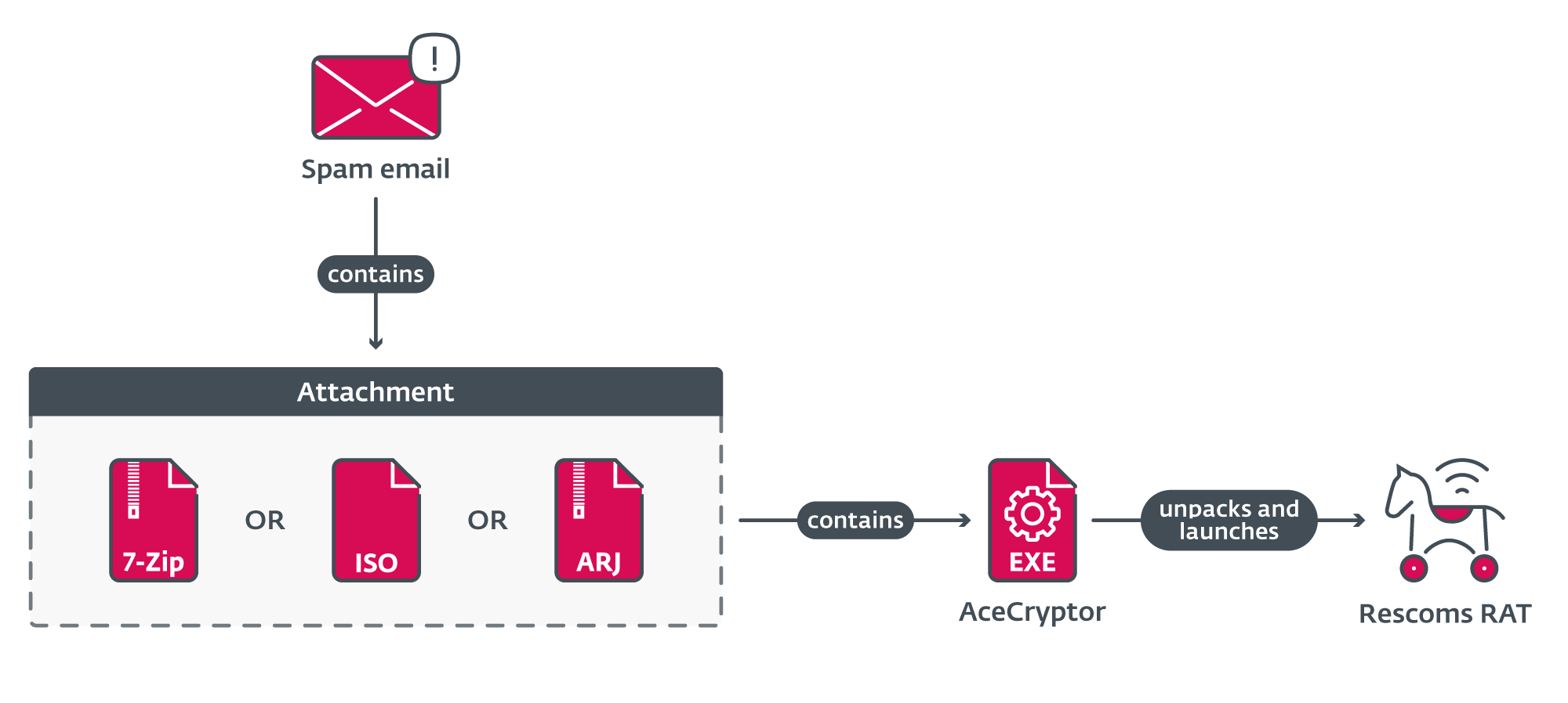 Załączniki we wszystkich kampaniach wyglądały dość podobnie. Wiadomości email zawierały załączone archiwum lub plik ISO o nazwie „oferta” lub „zapytanie”, w niektórych przypadkach wraz z numerem zamówienia. Załącznik zawierał plik wykonywalny AceCryptor, który rozpakowywał i uruchamiał Rescoms.