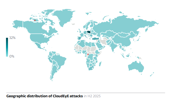 Najbardziej zauważalna w minionym półroczu była kampania phishingowa dystrybuująca złośliwe oprogramowanie CloudEyE, służące do instalacji ransomware czy infostealerów (np. Agent Tesla, Formbook). Liczba detekcji jednego z wariantów w języku PowerShell wzrosła w tym okresie niemal trzydziestokrotnie, przekraczając 100 tysięcy przypadków. ESET jednoznacznie wskazuje Polskę jako główne centrum tych ataków. Dane telemetryczne ujawniają niepokojącą skalę koncentracji zagrożeń w naszym regionie: najwyższy globalny pik detekcji tego malware odnotowano właśnie w Polsce, w dniu 18 września.