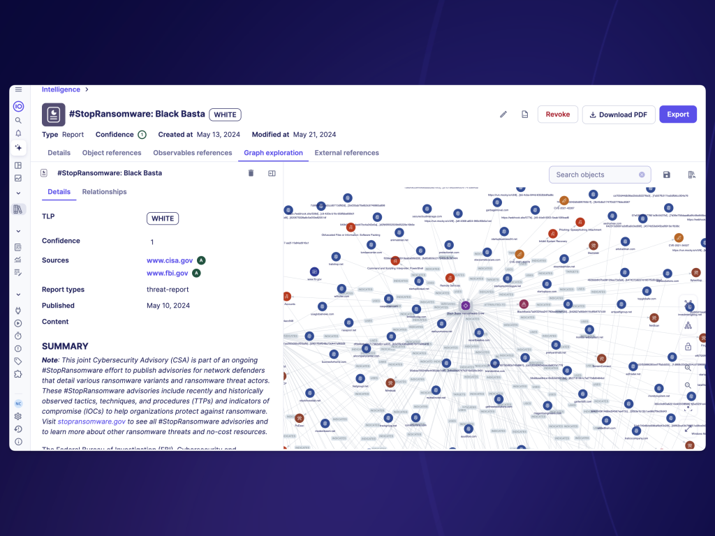 - Gromadzenie i modelowanie w formacie STIX 2.1 najbardziej istotnych raportów ze społeczności cyberbezpieczeństwa dotyczących zagrożeń, które śledzimy z priorytetem. Większość tych raportów jest również wzbogacana o reguły YARA i nowe wskaźniki kompromitacji (IOC) generowane na podstawie pivotów.