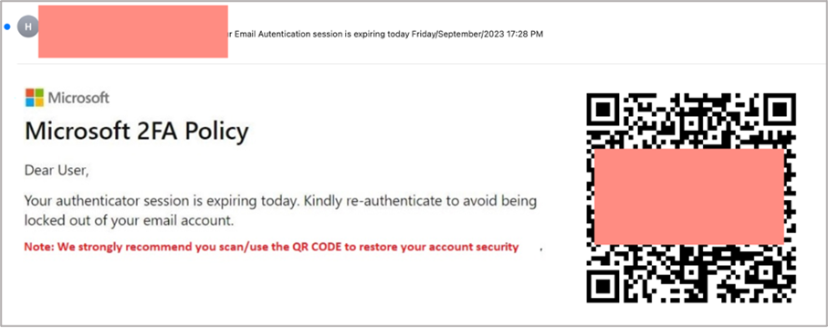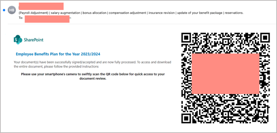 Atakujący osadzają kody QR w e-mailach phishingowych, zachęcając użytkowników do zeskanowania kodu i odwiedzenia fałszywej strony, która sprawia wrażenie zaufanej usługi lub aplikacji. Ofiary zazwyczaj są proszone o podanie swoich danych do logowania, które są następnie przechwytywane przez przestępcę.
