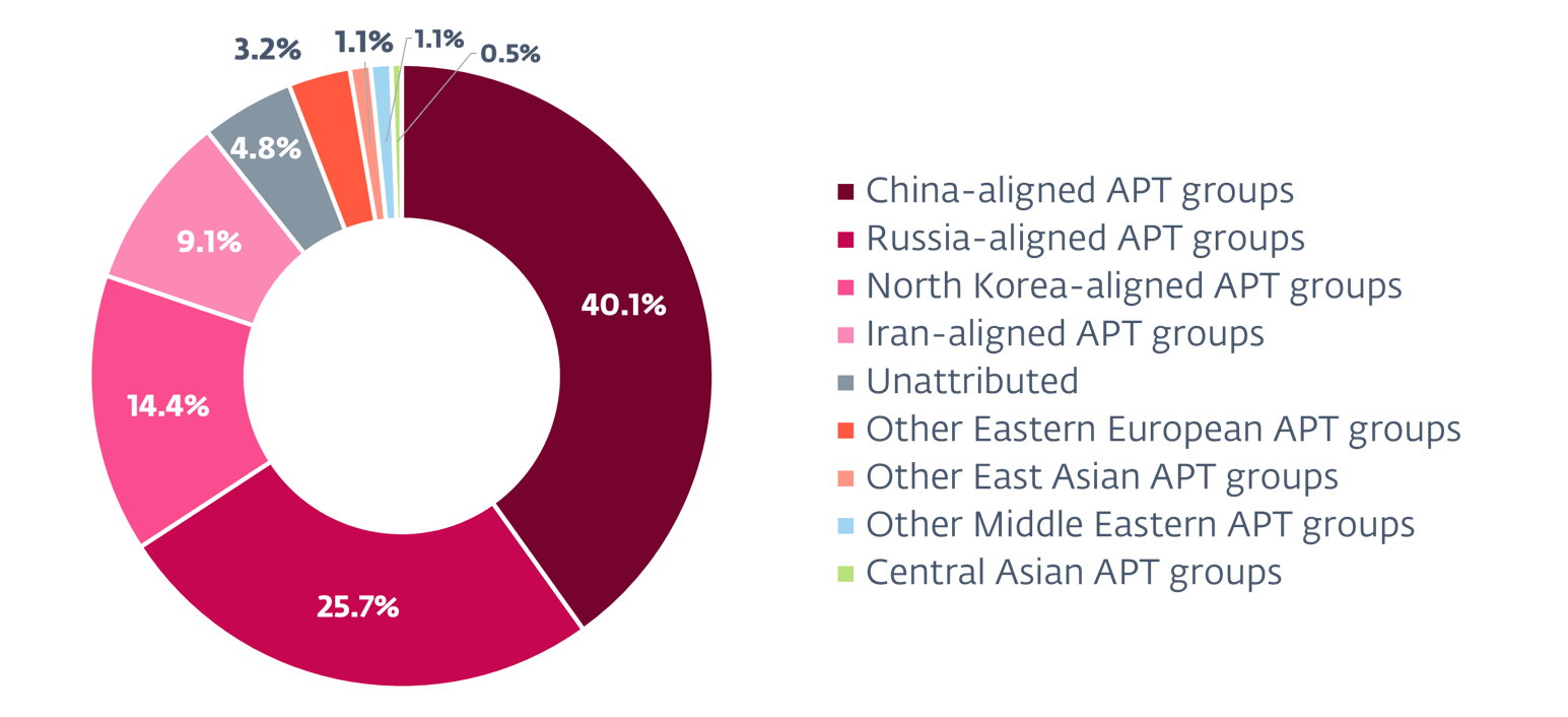 Analitycy ESET podsumowali działania grup APT w ostatnim półroczu (październik ’24-marzec ’25)1. W odniesieniu do poprzedniej edycji raportu wciąż najbardziej aktywne pozostają grupy powiązane z Chinami (odpowiadają za 40,1% działań) oraz Rosją (25,7%). Zauważalna jest również aktywność grup powiązanych z Koreą Północną (14,4%) oraz Iranem (9,1%).