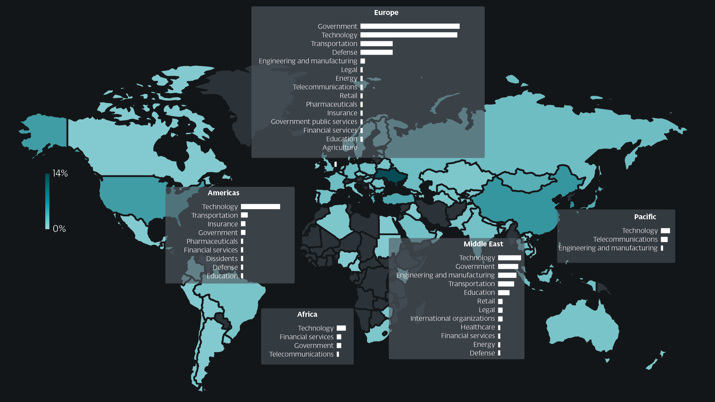 Nasz raport pokazuje, że w całej Europie to podmioty rządowe pozostawały głównym celem działań szpiegowskich prowadzonych przez grupy APT, podczas gdy na pozostałych kontynentach kluczowym celem ataków jest sektor technologiczny. Ponadto sektor obronny znalazł się na 4. miejscu celów grup APT w Europie, a w przypadku pozostałych kontynentów w żadnym z nich nie znalazł się w TOP 5. Największą intensywność cyberataków odnotowano w Ukrainie – głównie w wyniku uporczywych kampanii grup powiązanych z Rosją, wymierzonych w krytyczną infrastrukturę i instytucje rządowe tego kraju