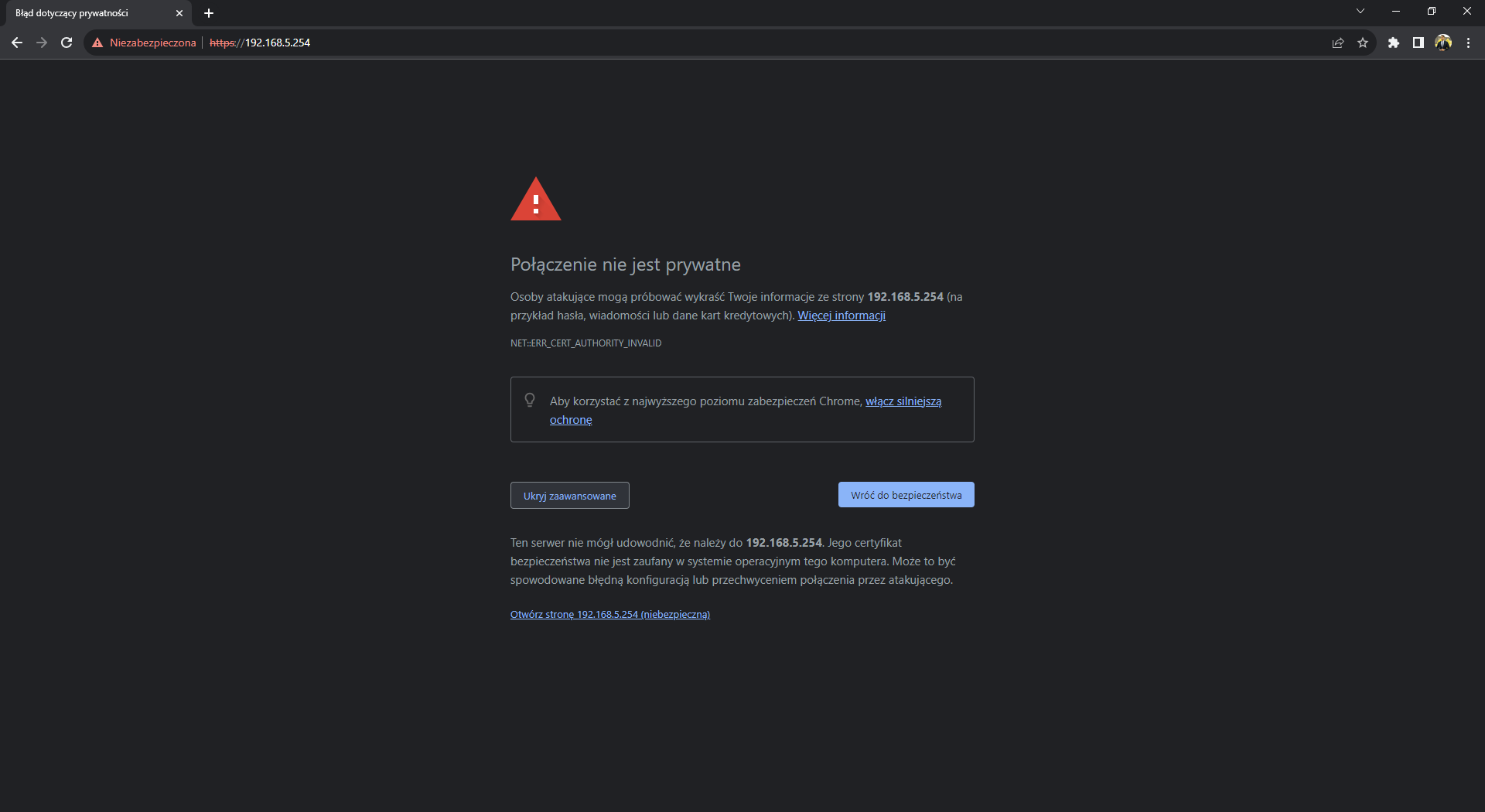 - Wchodzimy w przeglądarkę internetową i wpisujemy podany wcześniej adres IP maszyny, akceptujemy zagrożenie, klikamy „dalej”. Powinniśmy otrzymać taki widok: